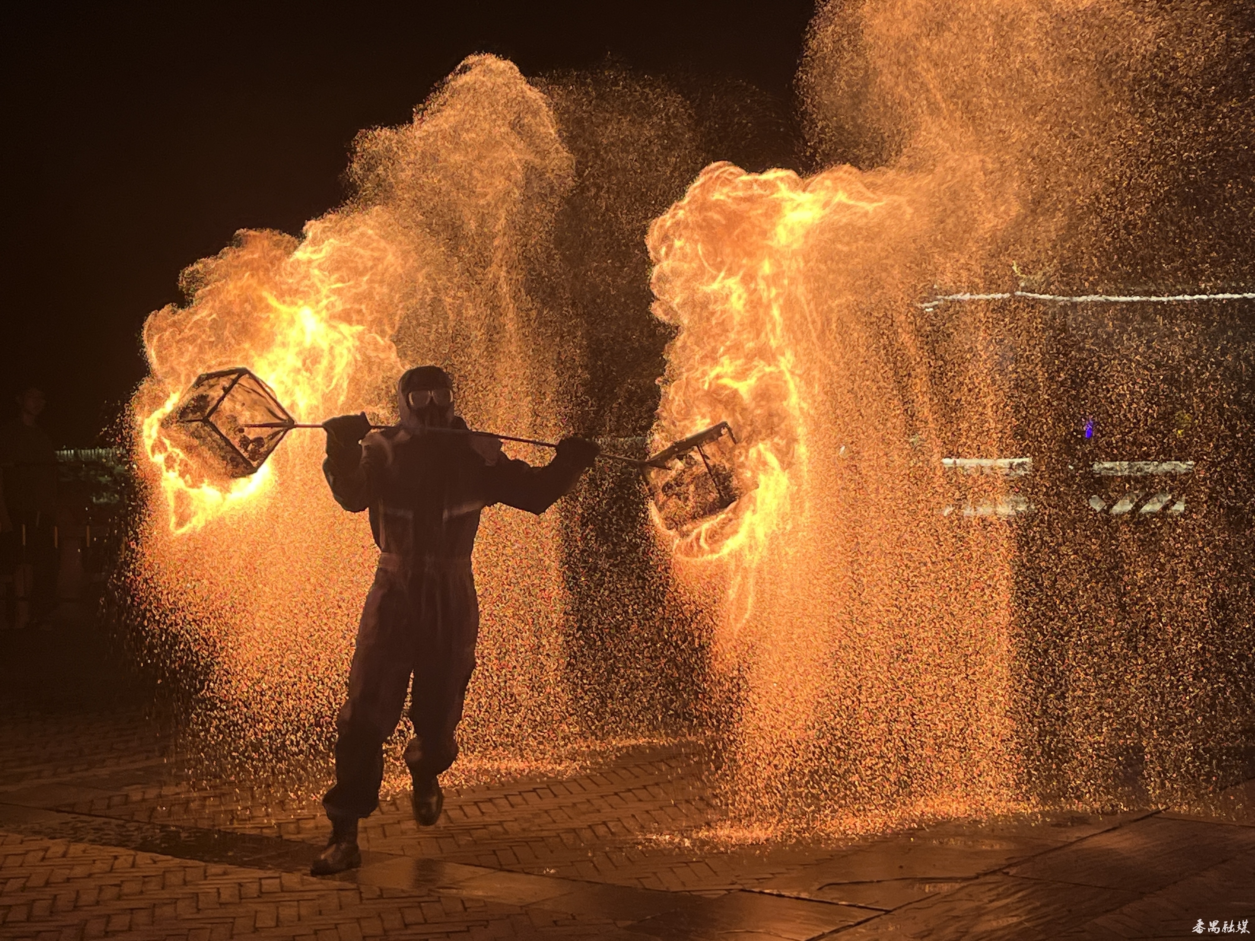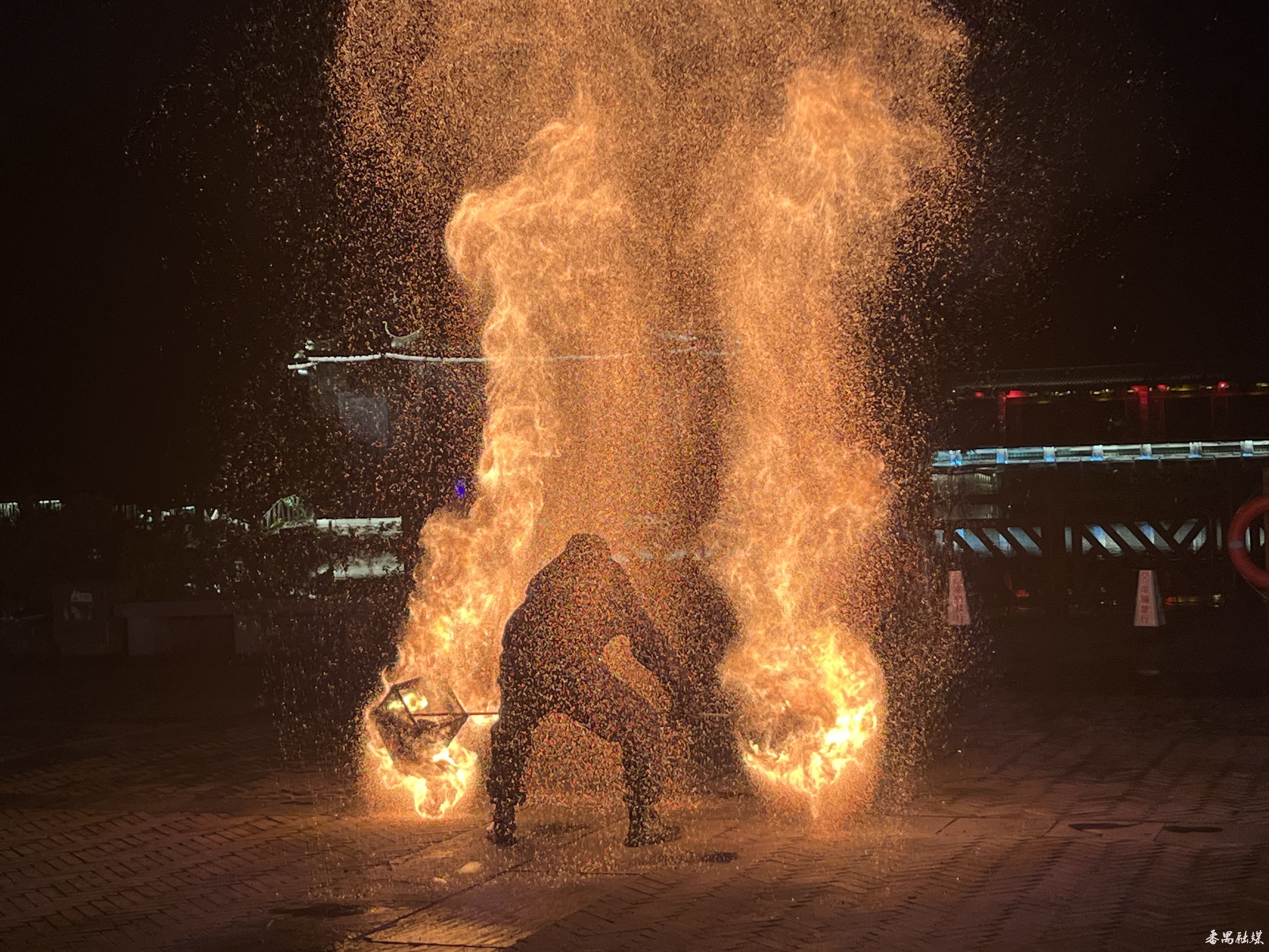 这个中秋节,更有民间绝技助兴增加喜庆的氛围。碎炭、起火、抖壶……夜幕降临,一场飞星夺目的非遗表演“火壶”正在上演。一抬一抖、一转一舞间,火焰瞬间升腾,汹涌而至,一团团、一簇簇的热烈火光如同红橙色水墨,在夜色中快速晕染,幻化成漫天的“星光”,璀璨缤纷、流光溢彩。中秋期间,火壶限时回归岭南印象园的中秋游园会,每晚两场,丰富群众的夜间文化生活,为夜间经济注入了新的活力。